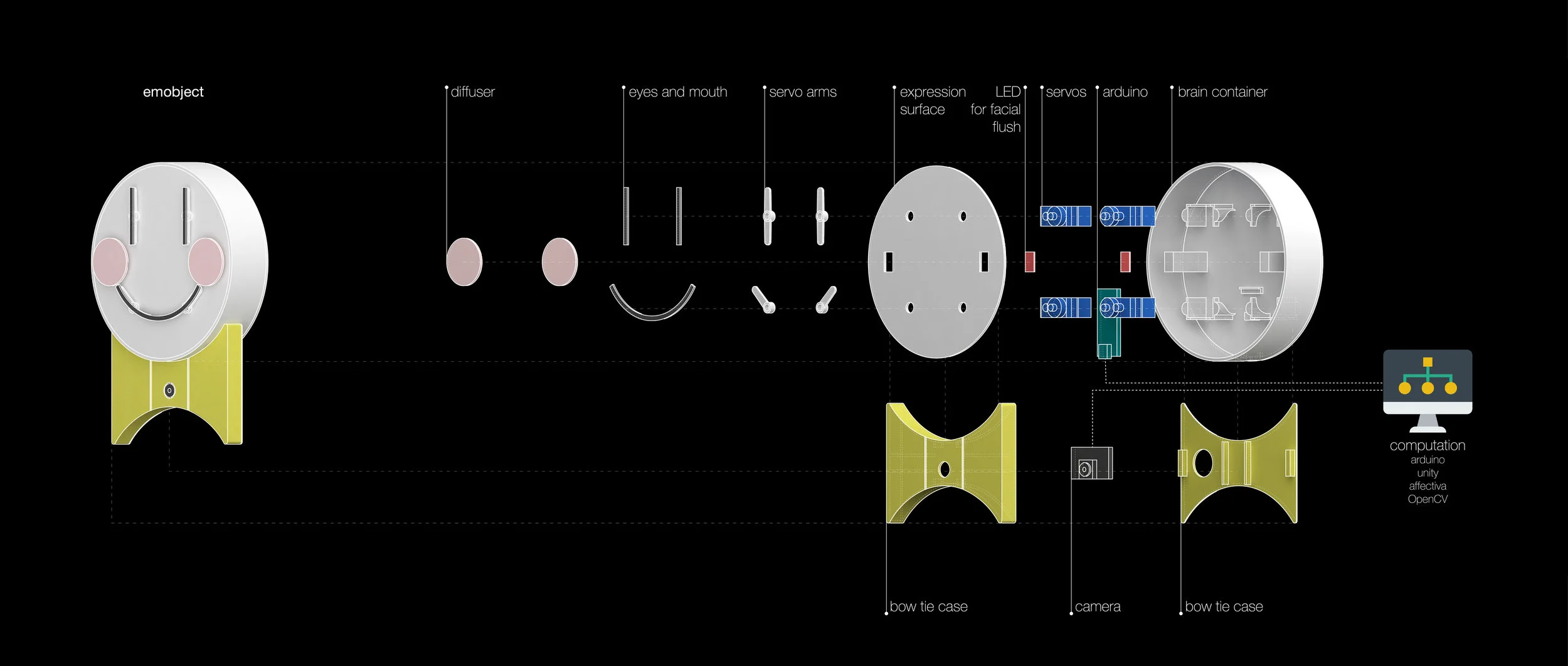 This project initially started out as an exploration into sensory substitution, emotion hacking, and the possibility of integrating interactive interfaces with human emotions. Could everyday objects convey information through emotions? Could we receive information about the state of an object or the state of a given environment through emotions; and in this way could we better internalize and relate to that information? What if we could seamlessly map digital information onto emotions, via a physical, tangible device that conveys a range of emotions through facial expressions, and then be able to monitor the dynamics of that information through the dynamics of the corresponding emotions? Moreover, could we also do the opposite – being able to control external devices or the state of different environments through changes of emotions / facial expressions? We developed a device that makes the aforementioned scenarios possible, and we called it Emobject.